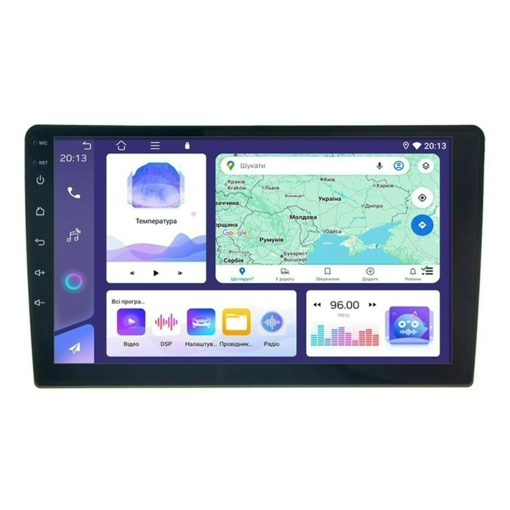 Універсальний мультимедійний центр планшетного типу, для встановлення через перехідну рамку, на операційній системі Android 10, з сенсорним QLED екраном, 9 дюймів. 4х ядерний процесор Allwinner A133 Plus, Cortex A53, 1.8ГГц, пам'ять: 4Гб х 64Гб.